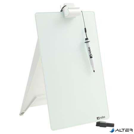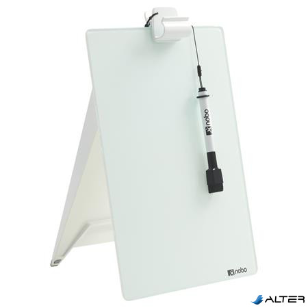 Az egyedülálló Nobo asztali üvegtábla állvány stílusos formatervezésének és hasznos, szárazon törölhető felületének köszönhetően kiváló eszköz a jegyzeteléshez. A keret nélküli, szárazon törölhető fehértábla felület tökéletesen ellenáll a tintafoltoknak és karcolásoknak. Csak írjon rá, törölje tisztára és kezdheti előröl. Akár jegyzetlapokat is rögzíthet rá az állvány tetején található csipesz segítségével. Nobo szárazon törölhető markerrel szállítjuk, mely táblatörlővel is rendelkezik a kupakon.