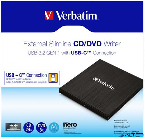 CD/DVD író, vékony, fém ház, USB 3.2 - USB-C, VERBATIM