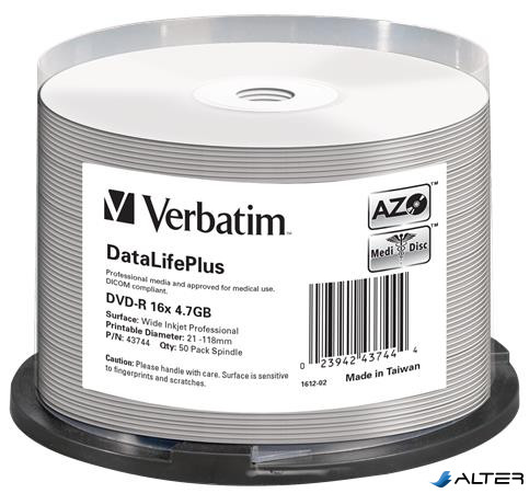 DVD-R lemez, nyomtatható, matt, no-ID, 4,7GB, 16x, 50 db, hengeren, VERBATIM