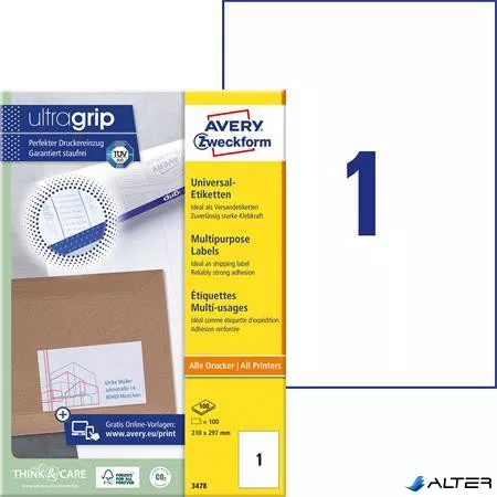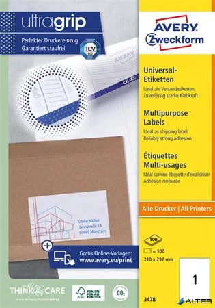 Etikett, univerzális, 210x297 mm, AVERY ZWECKFORM, 100 etikett/csomag