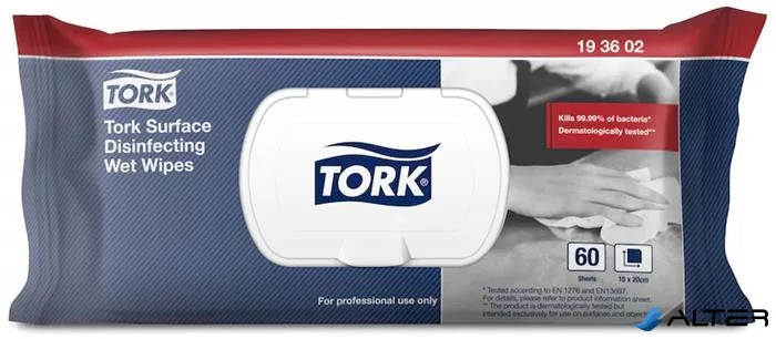 Felületfertőtlenítő tisztítókendő, nedves, 1 rétegű, 60 lap, visszazárható csomag, TORK, citrus