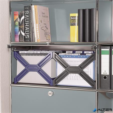 Erős, rakásolható függőmappatartó, 30 függőmappa tárolására alkalmas.