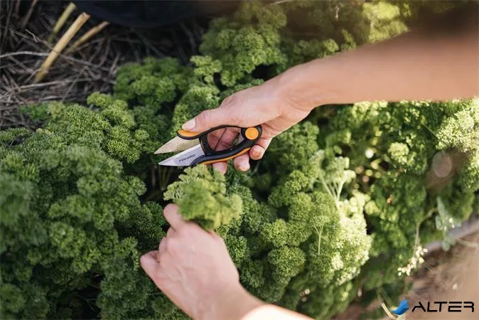 A Fiskars Solid™ SP220 fűszernövényvágó olló egy különleges kialakítású eszköz, amelyet kifejezetten friss fűszernövények, leveles zöldségek és kisebb növényi részek kíméletes és precíz vágására terveztek.