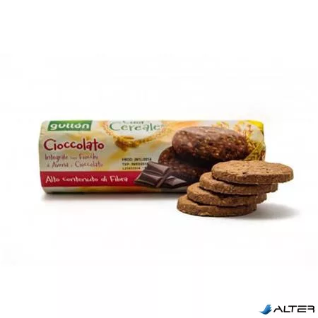 Gullon csokoládés teljes kiőrlésű búza, árpa, rozs gabonakeksz. Reggel vagy munka közben is kiválló nassolnivaló.