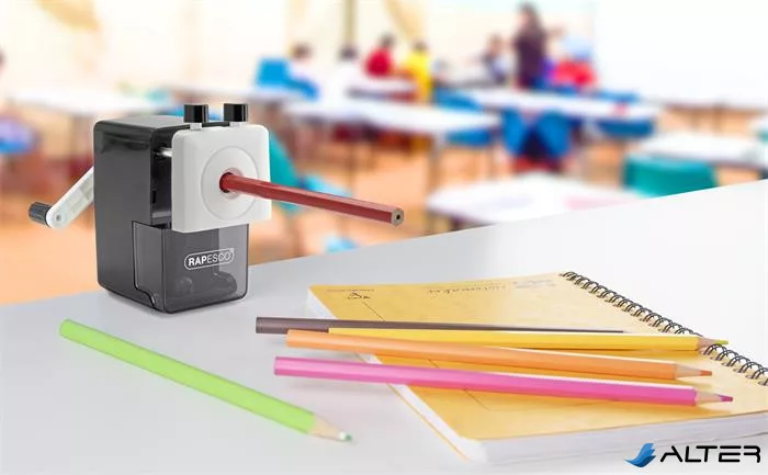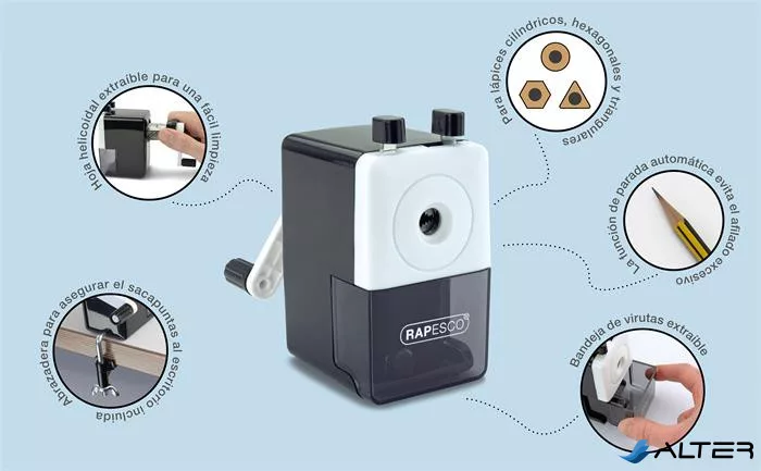 A Rapesco 64 asztali ceruzahegyezője stílusos, rendkívül funkcionális hegyező, amely számos funkcióval rendelkezik