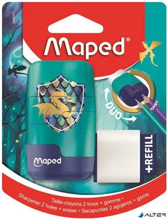 Hegyező és radír, kétlyukú, tartályos, pótradírral, MAPED "Connect Dragon", sárkány