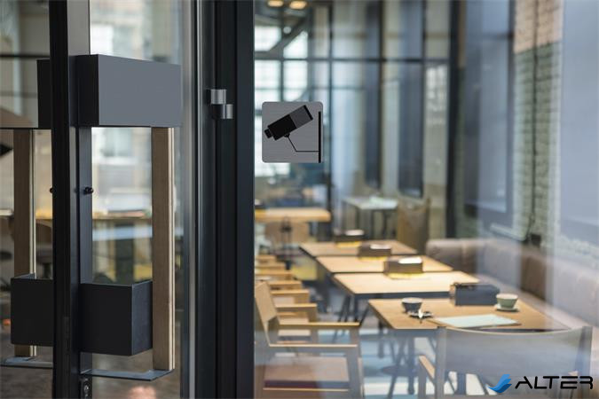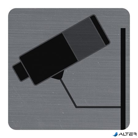 Információs tábla, öntapadó, 7,5x7,5 cm, alumíniumhatású, EXACOMPTA, "Kamerával megfigyelt terület"