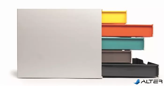 -kivehető fiókok színe: halvány sárga, piros-narancs, kék-zöld, platina szürke, szürke-kék