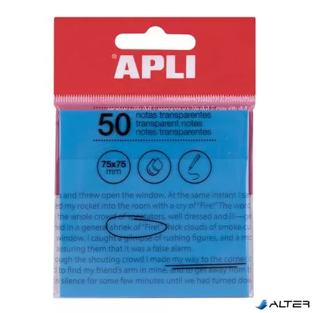 Öntapadó jegyzettömb, átlátszó, vízálló, 75x75 mm, 50 lap, APLI, kék