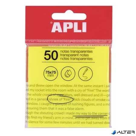 Öntapadó jegyzettömb, átlátszó, vízálló, 75x75 mm, 50 lap, APLI, sárga