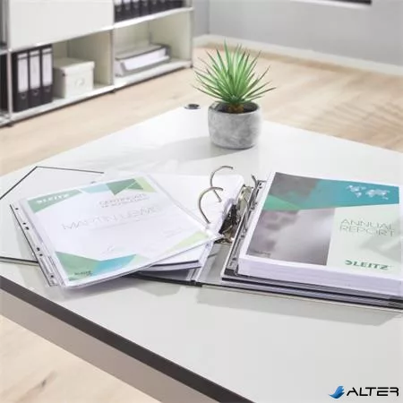 A nagy kapacitású lefűzhető tasakok ideálisak terjedelmesebb dokumentumokhoz és katalógusokhoz otthoni, irodai vagy iskolai környezetben. Kényelmes dokumentumtárolást biztosít, felül és jobb oldalon nyitott, így a tartalma könnyen hozzáférhető. Erős, fém, univerzális, 6 lyukú lefűzőrésszel rendelkezik, amely még a nehéz dokumentumokat is a helyén tartja. Akár 200 A4-es papírlap tárolásához is alkalmas, és kiváló minőségének köszönhetően többször újra felhasználható. A savmentes anyag biztosítja a dokumentumok védelmét, az átlátszó, tükröződésmentes kivitel - a tartalom könnyű olvashatóságát. PVC (polivinil-klorid) műanyagból készül, 48%-ban UL által auditált és tanúsított újrahasznosítottanyag-tartalommal.