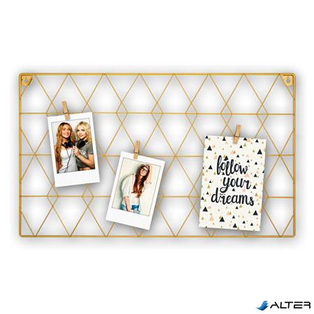 Geometrikus díszítéssel készült arany színű keret, 3 db fából készült fotócsipesszel.