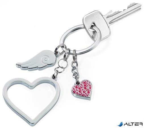 -kulcstartó 3 charm dísszel, szív (nagy), szív (kicsi), szárny