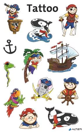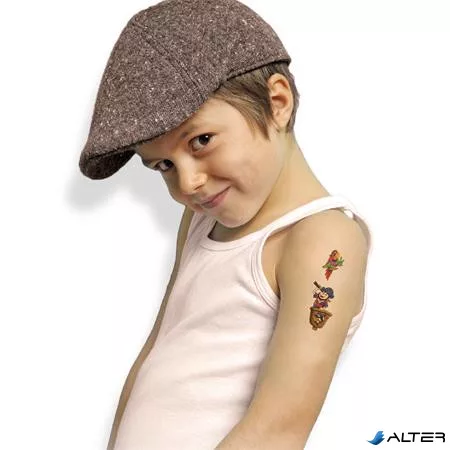 Kalóz tetoválás kis kalózoknak! Lepje meg gyermekeit nagyszerű tetoválásokkal, gyermekei imádni fogják a vicces kalóz tetoválást. Tökéletes ajándék, vagy apró meglepetés, amivel hazaérkezik, születésnapi partikra vagy egyszerűen arra, hogy a gyerekek játszanak.