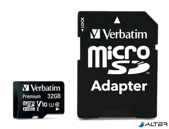 Memóriakártya, microSDHC, 32GB, CL10/U1, 90/10 MB/s, adapter, VERBATIM 'Premium'