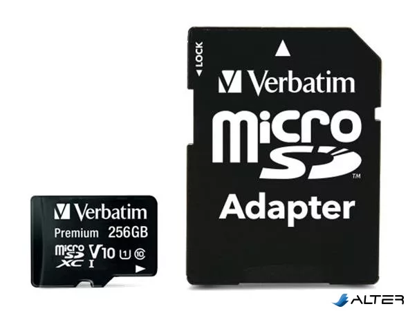 Memóriakártya, microSDXC, 256GB CL10/U1, 90/10 MB/s, adapter, VERBATIM 'Premium'