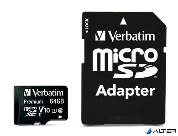 Memóriakártya, microSDXC, 64GB, CL10/U1, 90/10 MB/s, adapter, VERBATIM "Premium"