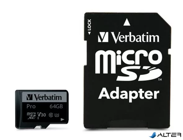 Memóriakártya, microSDXC, 64GB, CL10/U3, 90/45 MB/s, adapter, VERBATIM 'PRO'