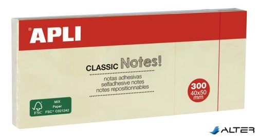 Öntapadó jegyzettömb, 40x50 mm, 3x100 lap, APLI "Classic", sárga