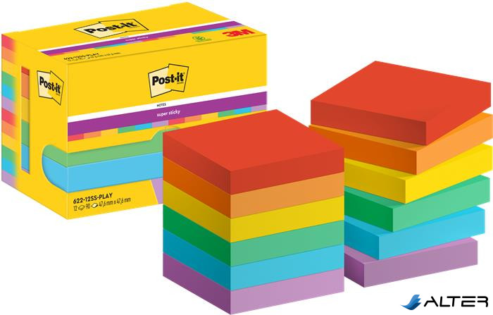 Öntapadó jegyzettömb, 48x48 mm, 12x90 lap, 3M POSTIT "Super Sticky Playful", vegyes színek