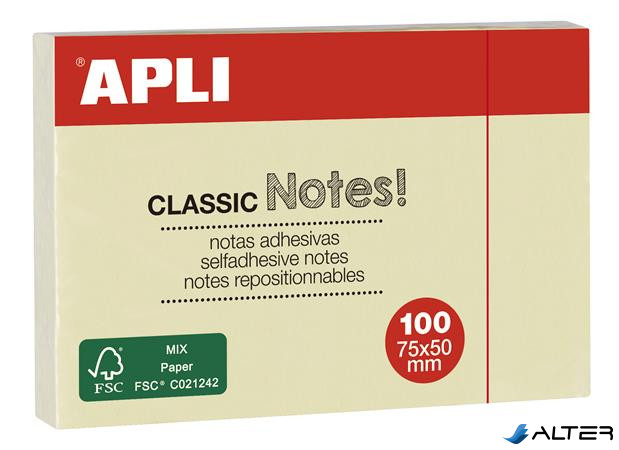 Öntapadó jegyzettömb, 50x75 mm, 100 lap, APLI "Classic", sárga