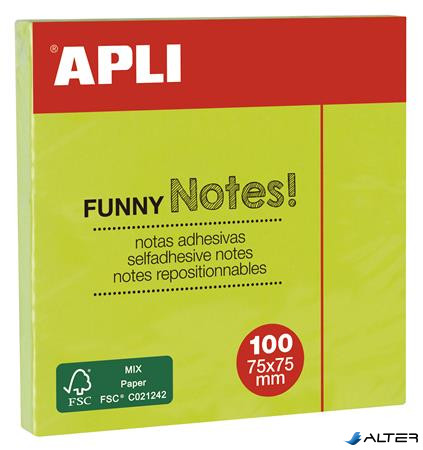 Öntapadó jegyzettömb, 75x75 mm, 100 lap, APLI 'Funny', neon zöld