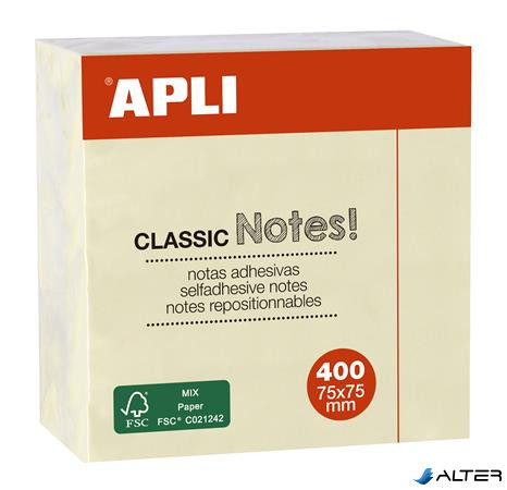 Öntapadó jegyzettömb, 75x75 mm, 400 lap, APLI "Classic", sárga