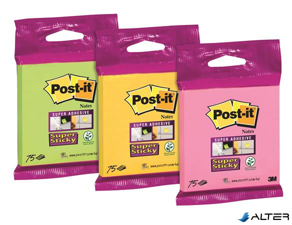 Öntapadó jegyzettömb, 76×76 mm, 75 lap, 3M POSTIT 'Super Sticky', vegyes