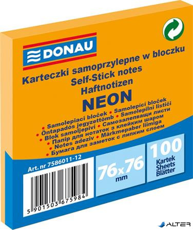 Öntapadó jegyzettömb, 76x76 mm, 100 lap, DONAU, neon narancssárga