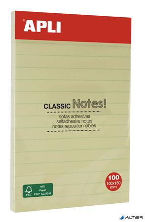 Öntapadó jegyzettömb, vonalas, 100x150 mm, 100 lap, APLI 'Classic', sárga