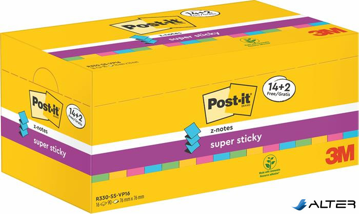 Öntapadó jegyzettömb csomag, "Z", 76x76 mm, 16x90 lap, 3M POSTIT, "Super Sticky", vegyes
