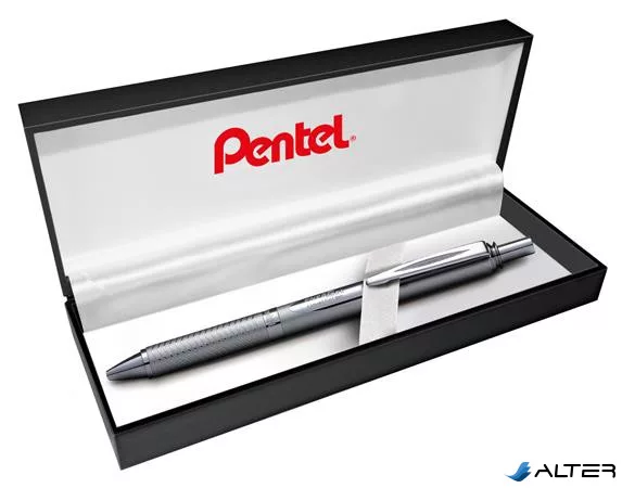 Zseléstoll, 0,35 mm, nyomógombos, ezüst tolltest, PENTEL "EnerGel BL-407" fekete, ajándék kék tollbetéttel