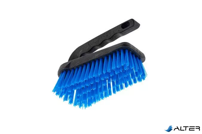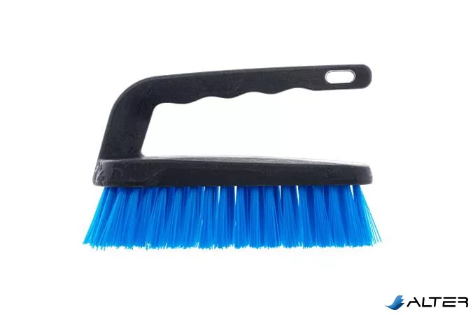 Fogantyús műanyag súroló kefe, műanyag szálakkal, nélkülözhetetlen takarítóeszköz a foltok és szennyeződések eltávolításához.