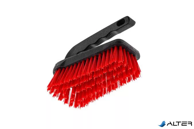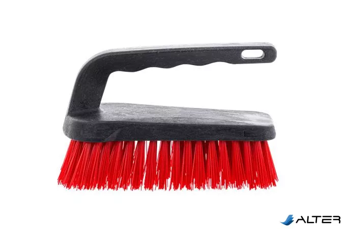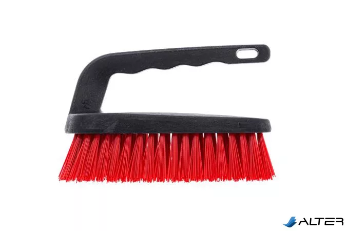 Fogantyús műanyag súroló kefe, műanyag szálakkal, nélkülözhetetlen takarítóeszköz a foltok és szennyeződések eltávolításához.