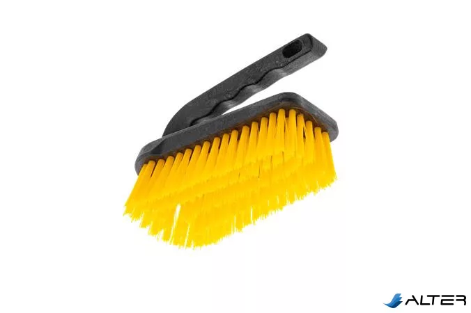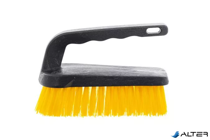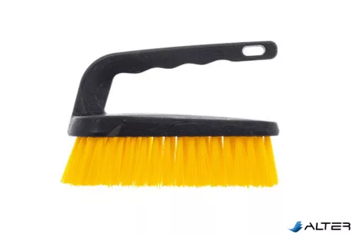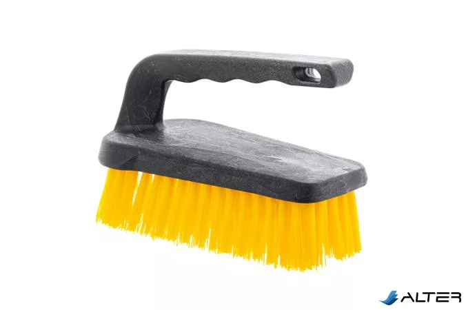 Fogantyús műanyag súroló kefe, műanyag szálakkal, nélkülözhetetlen takarítóeszköz a foltok és szennyeződések eltávolításához.
