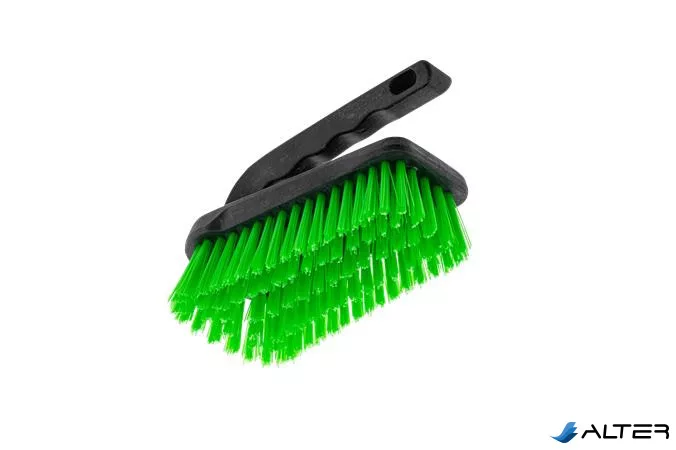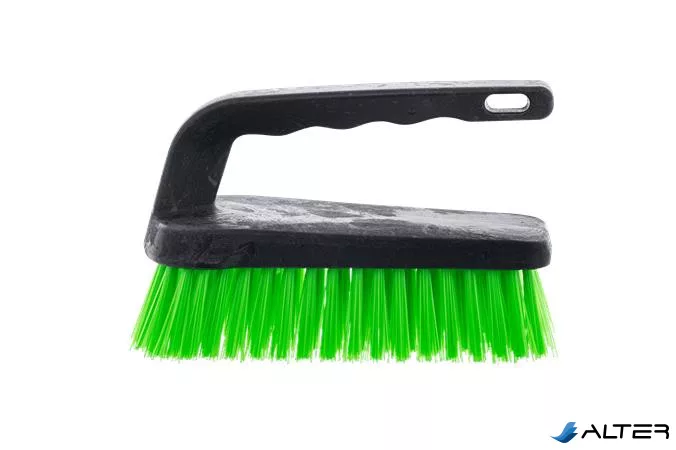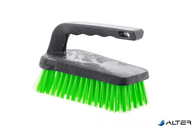 Fogantyús műanyag súroló kefe, műanyag szálakkal, nélkülözhetetlen takarítóeszköz a foltok és szennyeződések eltávolításához.