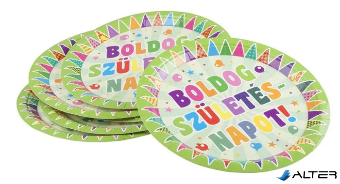 Tányér, papír, 23 cm, "Boldog születésnapot", zászlós