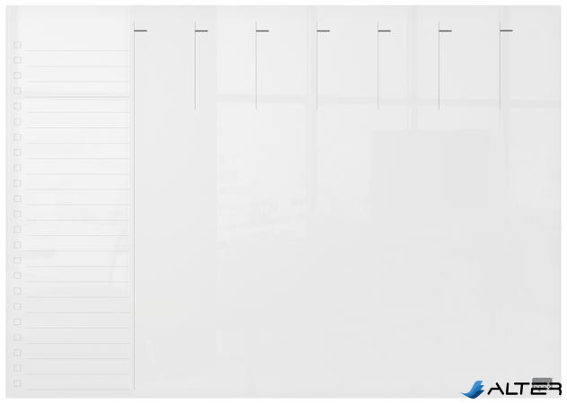 Ez az otthoni irodai, heti tervezőtábla a modern, keret nélküli kialakításnak és heti beosztású rácsozásnak köszönhetően ideális jegyzeteléshez, gondolatok, ötletek, fontos dátumok feljegyzéséhez. A ragasztópárnák és mágnesek segítségével fém felületekhez rögzítve falitáblaként, vagy asztalra és egyéb munkafelületre fektetve asztali fehértáblaként is használható. Az átlátszó kialakításnak köszönhetően az emlékeztető tábla használaton kívül észrevetlenül beleolvad a környezetébe. Szárazon törölhető felülete könnyen tisztán tartható, egyszerűen írjon rá, törölje le és kezdheti elölről. Tartozék: 1db táblatoll. Méret: A3.