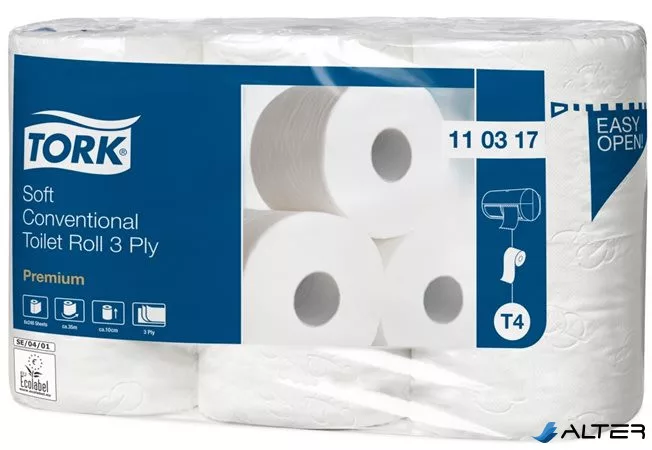 Toalettpapír, T4 rendszer, 3 rétegű, 12 cm átmérő, Premium, TORK 'Soft', fehér