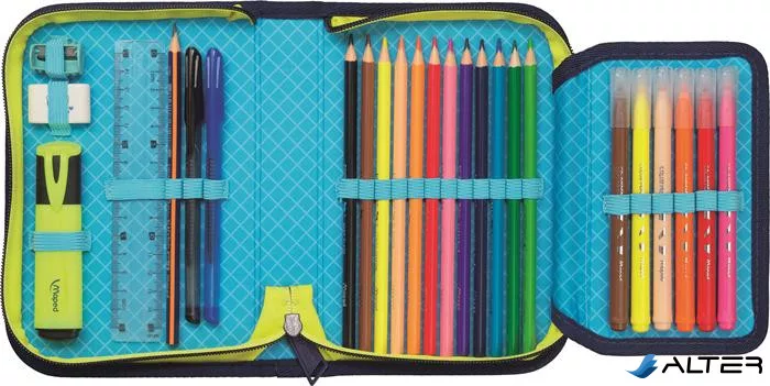 Töltött tolltartó divatos mintával, amely minden szükséges írószert tartalmaz a tanórákhoz. Praktikus kialakításának köszönhetően a ceruzák, radírok, ollók és egyéb eszközök átláthatóan rendszerezhetők benne.